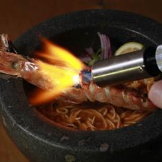 Preparamos el caldo de langostinos rehogando el ajo, la cebolla y la pasta de chili durante unos 5 o 10 minutos. Añadimos las cabezas y ponemos a fuego fuerte cinco minutos más. Añadimos el coñac y flambeamos.Incorporamos el caldo de pescado y dejamos cocer durante 15 minutos aproximadamente. Trituramos y colamos.Salpimentamos y reservamos.Cocemos los noodles y reservamos. Cortamos los langostinos y el salmón en dados. Calentamos el caldo de langostinos, añadimos los noodles, el salmón y los langostinos.Cocemos todo junto durante dos minutos más. Terminamos remantando la jugada con la cebolla roja, el cilantro y el zumo de lima.