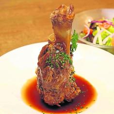 Salpimentamos los codillos y doramos en la misma olla en la que vamos a guisar. Apartar y añadir las verduras hasta que doren. Añadir los codillos y los aromáticos para que se unan los jugos y caramelicen. Añadimos el vino y luego el coñac. Cuando reduzca el alcohol añadimos el caldo y a fuego lento cocinamos hasta que esté tierna la carne. Acompañamos de una ensalada con tomate cherry, hojas de mezclum, cebolla, aceite y vinagre de sidra.