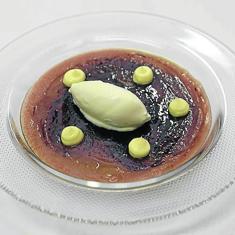 Asamos a 180º la manzana entera durante una hora. Trituramos y agregamos la mantequilla y el aceite poco a poco. Pasamos por un colador lo más fino posible y dejamos cuajar emplatado. Una vez frío añadimos azúcar y requemamos.Para la crema de lima montamos la crema inglesa a 85º al baño maría e incorporamos poco a poco el zumo y la gelatina.Añadimos una bola de helado de vainilla comercial.