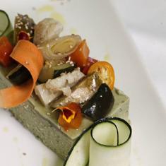 Por un lado saleteamos las espinacas y los puerros junto a la pimienta y el perejil. Añadimos la nata y dejamos que todo se cocine a fuego lento.Trituramos y añadimos el agar agar.Pasamos a un molde cuadrado y refrigeramos en nevera durante 6 horas. Por otro lado, troceamos las verduras que vamos a emplear para asar y las blanqueamos.Las metemos al horno a 180º hasta que estén cocinadas a nuestro gusto. Presentamos la panacota con forma rectangular y colocamos por colores las verduras asadas sobre ella.