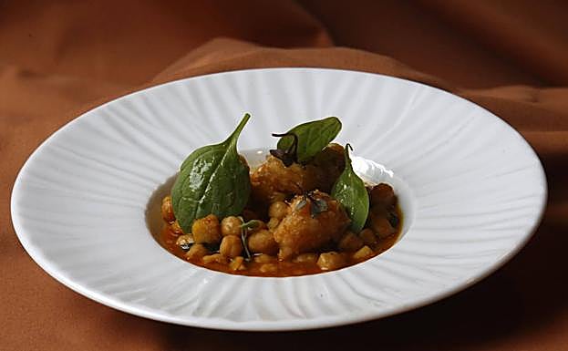 El potaje de garbanzos y espinacas que prepara el equipo de cocina, dirigido por Rabii Yahyaoui, lleva también buñuelos de bacalao macerado en miso. Esta propuesta hace un guiño a que la tradición no está reñida con la innovación. Para prepararla hay que dejar los garbanzos en remojo durante, al menos, ocho horas. Después, se cuecen en agua con un poco de sal. «Es importante echarlos cuando el agua aún está fría y dejarlos a fuego lento dos horas o 19 minutos si se utiliza una olla rápida», apunta el jefe de cocina. Lo fundamental es que queden cocidos, pero no deshechos.