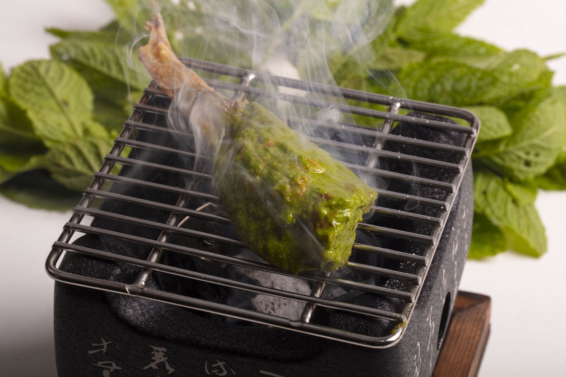 -Quitamos los pinchos y pintamos con el mojo de menta por ambas partes. Terminamos el plato echando unos brotes de menta, sal maldon y un toque de wasabi fresco.