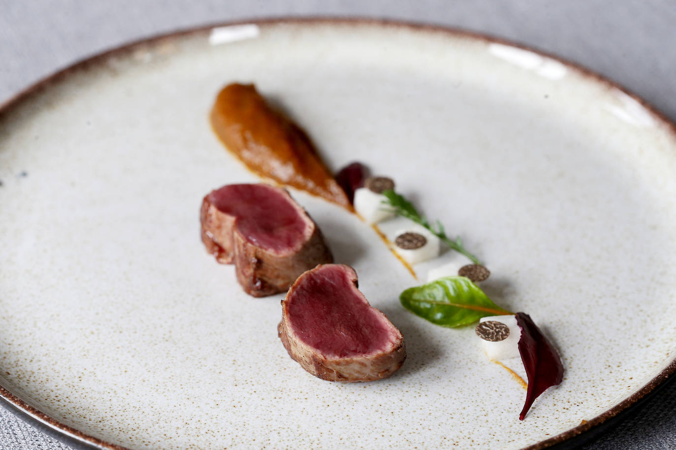 -En plato llano, disponer una lágrima de la crema de zanahoria y trufa. A la izquierda, colocar el lomo de venao al punto cortado en dos y terminar con la sal de escamas. A la derecha de la lágrima, colocar los dados de gelatina de pimientos asados, láminas de trufa, los nabos cortados en dos mitades, los brotes de amaranto y terminar con las gotas de aceite de zanahoria. Acompañar con una rama de romero quemado.