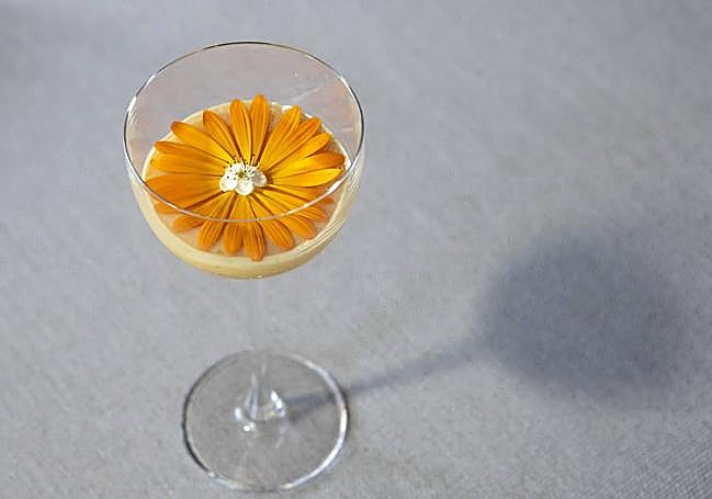 -En copa, base del tocinillo de cielo, cubrimos con kombucha y pétalos de caléndula y terminamos con la flor de endrino.