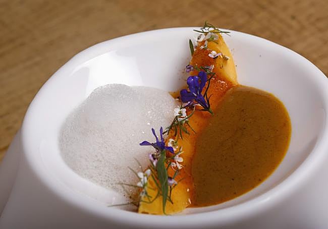 - Licuar dos chiles habaneros sin pepas con aceite de oliva y batir vinagre de arroz con lecitina de soja. Colocar el mango en el centro del plato y, encima, siete gotas de aceite de habanero y brotes de hierbas. A un lado del mango, poner una cucharada de tikka masala muy caliente y, al otro, una de aire de vinagre.