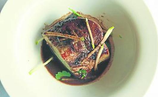 9. Emplatamos en un plato hondo y espacioso, colocamos el lomo de bonito recién sacado del horno. Le arrimamos el foie y para finalizar salseamos con la salsa de chocolate.