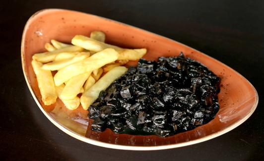 7. Unimos al majado las bolsinas de tinta de los calamares y el chorro de vino tinto.