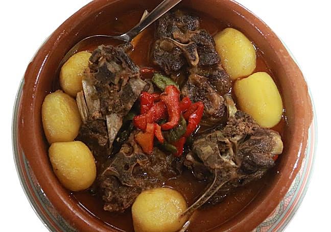 4 trozos grandes y jugosos de pierna y costilla. 1 diente de ajo. 2 cebollas.1 pimiento rojo. 1 pimiento verde. 1 ajo puerro, 1 zanahoria, 1 ramín de perejil, 1 hoja de laurel, tomillo, pimienta negra molida. vino blanco, brandy, fino y ½ kilo de patatinos.