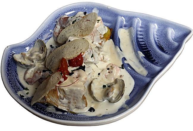 Ingredientes: 300 gramos de bonito. 50 g. de almejas. 50 g. de langostinos. 60 g. de carne blanca de crustáceo. 60 g. de carne de oricios. 500 g. de crema de nata. Sal al gusto.