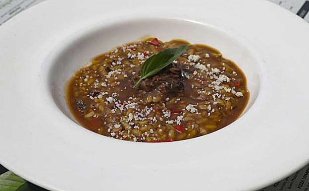 6. Justo antes de apartar el arroz, añadimos el rabo de toro desmechado.