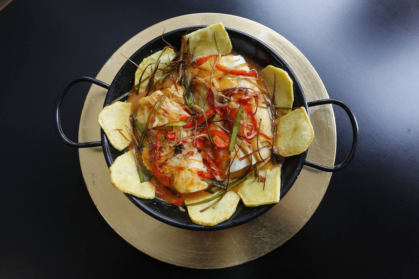 4 lomos de bacalao salado. 2 patatas panaderas. Cebolla. Pimiento rojo. Caldo de pescado natural y aceite de oliva extravirgen de la máxima calidad.