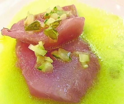 Había muchas opciones para elegir, pero la textura de este bonito, lo bien que le iba la vinagreta de pimiento, elegantísima, y la frescura que le aportaba los trocitos de apio fermentado, hacen un plato muy interesante. Sencillez bien interpretada.