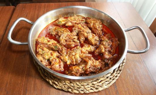 8. En una tartera aparte, sobre una placa antiadherente, colocamos lo uños deshuesados en capas, añadimos caldo sin llegar a cubrirlos, repartimos y cubrimos por encima de cebolla picada, de un majado de ajo y perejil desleído con vino blanco y repartimos una cucharadita de pimentón dulce y un chorro de aceite.