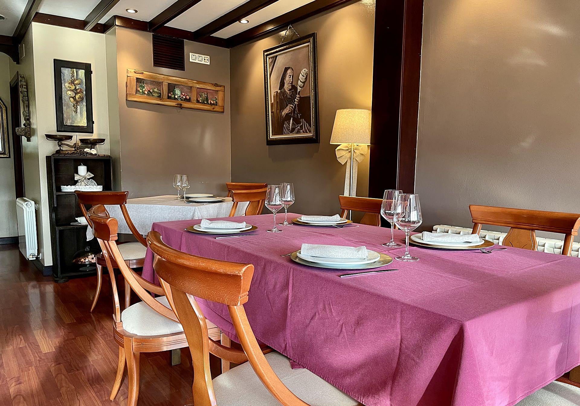 Tiene dos plantas, más bonita la superior, de hermosas vistas. Cuenta con terraza a la vera de un hórreo, que es un remanso de tranquilidad, ideal para el aperitivo o la sobremesa. Mantel y servilleta de tela, con una decoración y mobiliario clásico.