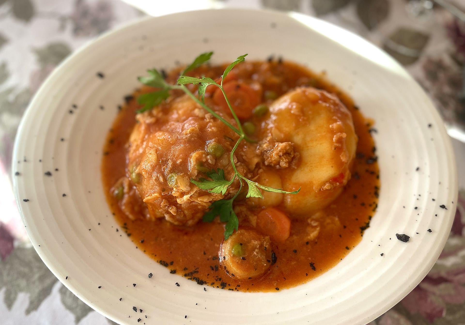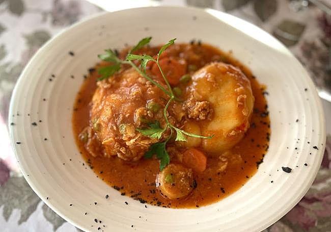 Hacía tiempo que no comía unas patatas rellenas tan naturales y tan ricas. Son de carne y con una salsa de tomate y verdura de la huerta propia, y se nota. El relleno estaba tierno y cocinado el tiempo justo para no perder textura. Impecables.