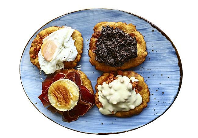 7. Encima de cada uno, pensando en cuatro por comensal, colocamos un huevo, morcilla matachana a modo de paté, picadillo roxu de matanza con crema de Cabrales y jamón de bodega junto a una rodaja de queso de cabra.