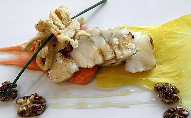 Lingote de pixín braseado sobre parmentier de afuega'l pitu roxu, tallarines de calamar y nueces a la miel