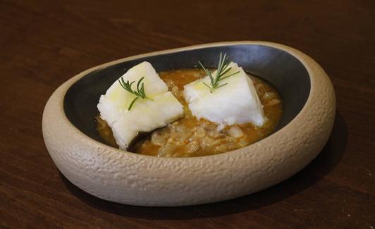 Por base, guiso de tendones, encima los dos cogotes de bacalao, y de remate un poco del pilpil.