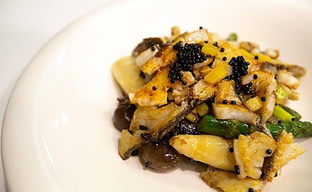 7. Aliñamos con la vinagreta y terminamos el emplatado con el caviar de arenque a modo de adorno.