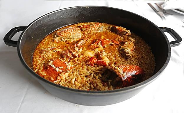 Y arroces. Grano acquarello blanco, suelto, justo de dente y con los mismos nutrientes que el integral, a los que añaden suculentas almejas, bugres, nécoras, langostas, andaricas, calamares y cuanta marinería demande esa cazuela baja y con asas llamada paella y universalizada con el nombre de paellera, la guisandera especializada.