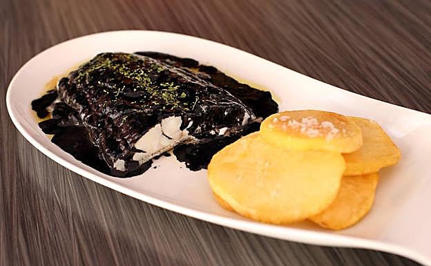 Elaboración: Metemos los lomos ya desalados, una vez escurridos y suavemente secados tras presionarlos con un paño, en el horno durante doce minutos. El horno estará previamente calentado a ciento sesenta grados. Aparte, confitamos cebolla, para lo que hemos de cortarla en finas tiras, salarla, echarla en una sartén con aceite de oliva, y tenerla mucho tiempo a fuego lentísimo, dándole vueltas y vueltas hasta que quede melosa; una cucharadina de azúcar mejora el resultado. Por otro lado sofreímos pimiento rojo, pimiento verde y puerro. Una vez los tengamos muy tiernos, los pasamos a crema en la trituradora. Añadimos al triturado la tinta de las bolsitas de calamar. Lo pasamos nuevamente a la sartén hasta que dé un par de hervores. En cada plato colocamos, de base, la cebolla confitada, encima el lomo de bacalao y cubrimos con la salsa negra de pimientos y puerros. Acompañamos con patatas panaderas fritas suavemente y con un toque de calor alto final para que queden cremosas por dentro y crujientes afuera.