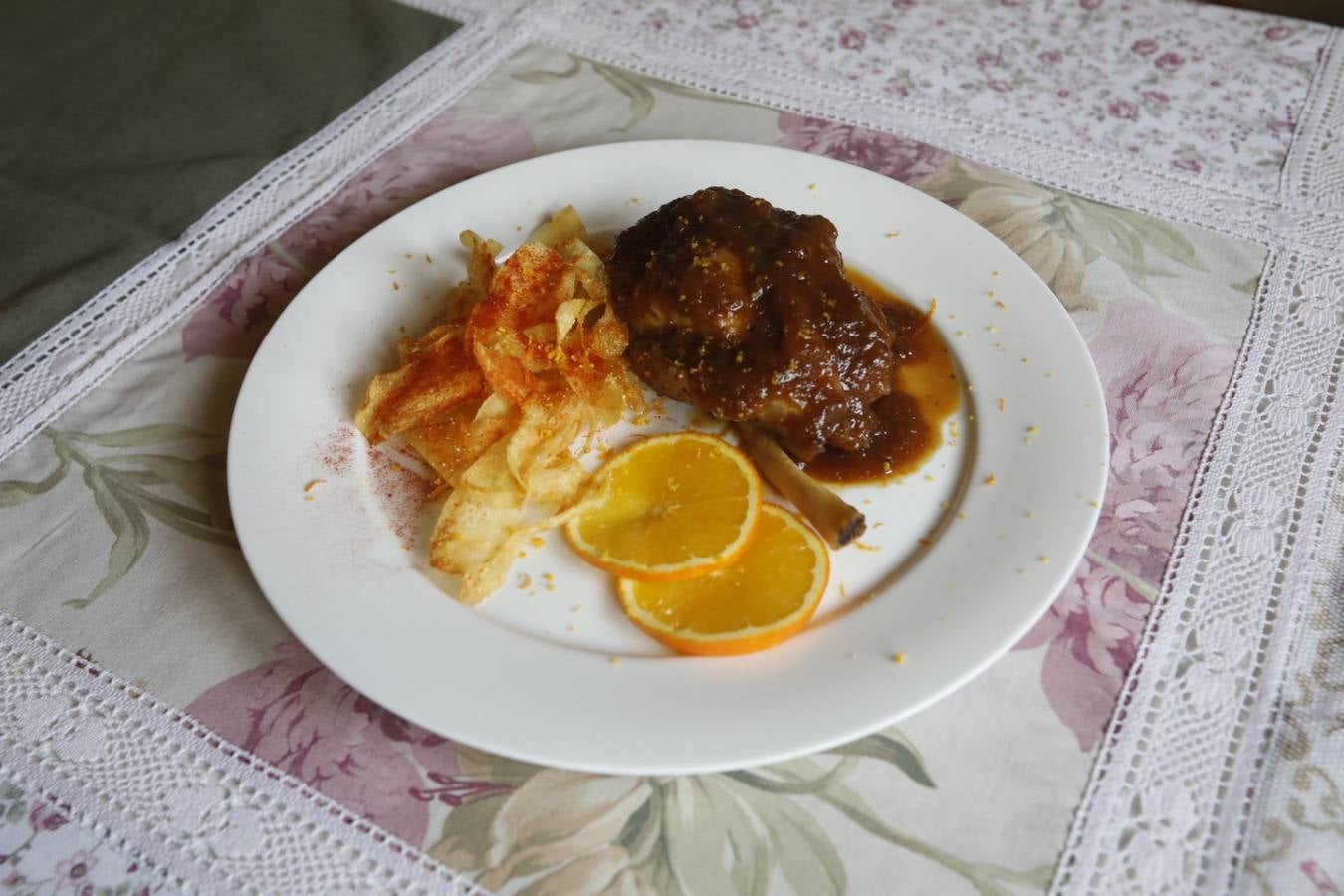 10. Durante la cocción, ponemos las rodajas de naranja a confitar con agua y licor de naranja (las utilizamos después para presentar el plato).