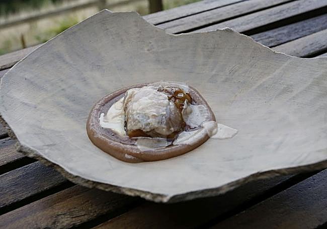Emplatado: la berenjena, con brochazo de soja, miel y brandy, se marca en sartén, se coloca sobre el pilpil, se rodea de crema de dátil y se corona con lascas de la mayonesa de tuétano.