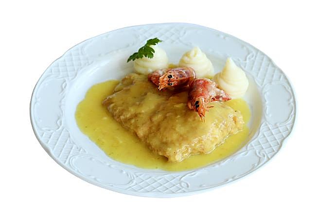 4 filetes de lenguado, 4 lonchas de jamón cocido, 4 lonchas de queso tierno asturiano, harina y huevo para el rebozado, 1 vasín de vino blanco, 3 decilitros de fumé, 12 gambas peladas, oliva extravirgen, sal. Para la salsa verde: 1 diente de ajo, 1 cebolla, vino blanco, perejil.