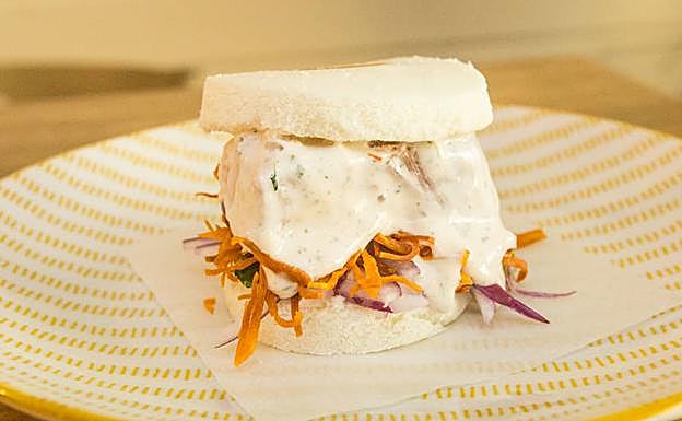 9. Colocamos todo lo anterior, bien salseado, dentro de cada pan bao;pan en forma de hamburguesa que elaboramos al horno de vapor con harina, levadura fresca, leche y sal.