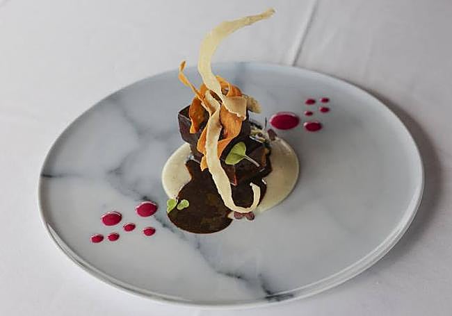 Carrillera de ternera guisada al Pedro Ximénez con parmentier trufada de apionabo y chips de yuca