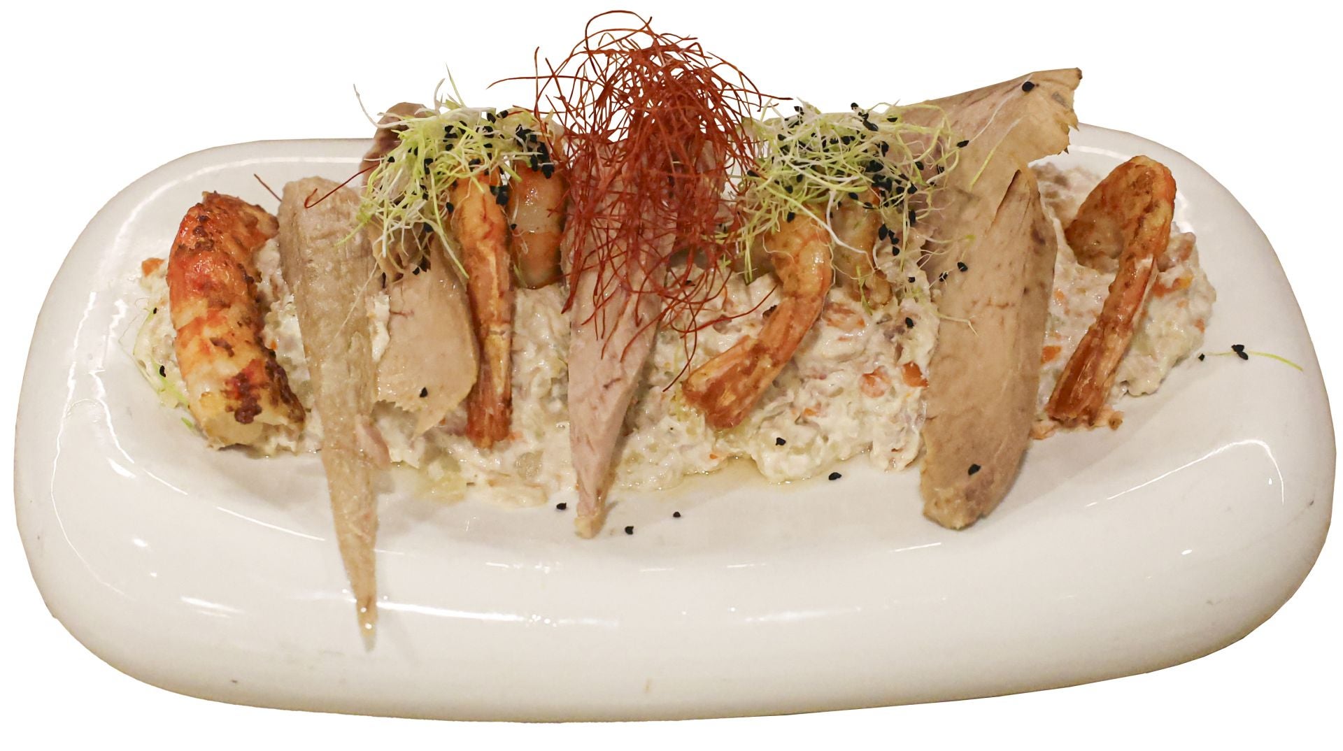 Ingredientes por comensal: 1 patata, 1 zanahoria, 1 huevo cocido, 1 corte fino de pan brioche, lascas de bonito en conserva casera de oliva, langostinos, mahonesa, vinagre de jerez, aceite verde (o de olivas poco maduradas), sal.