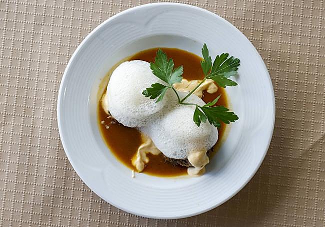 Carrilleras en nubes de sidra con salsa afuega'l pitu