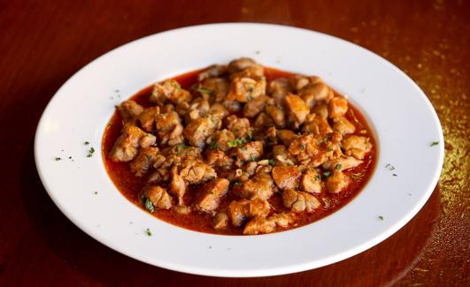 1 kg. de molleja de ternera-5 dientes de ajo-caldo de carne-chupito de whisky -pimentón de La Vera -2 ó 3 guindillas -aceite de olivapimienta blanca-sal.