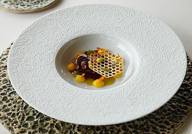 Pulpo guisado con crema de maíz ahumada y verduras tatemadas