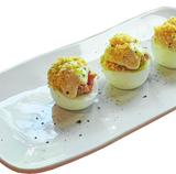 - Cortamos los huevos a la mitad horizontalmente y reservamos la clara para rellenar: la mitad de las yemas será para la siguiente elaboración y la otra mitad, para acabar el plato.