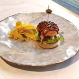 -Cerramos la burguer y acabamos pintándola con teriyaki y unos granos de sésamo tostado. En el restaurante las servimos acompañada de chips de plátano macho.