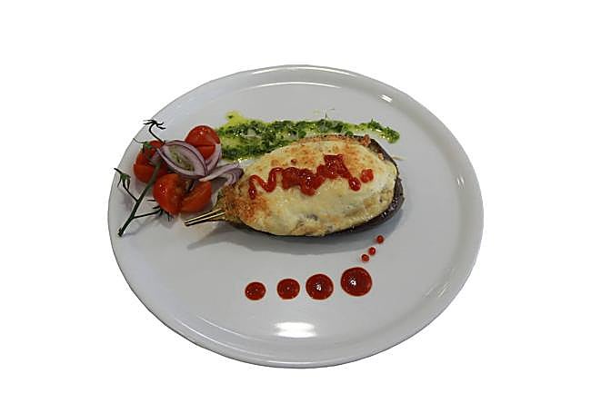 Ingredientes para 4 comensales.100 gramos de xata roxa picada. 200 gramos de tomates. 100 gramos de cebolletas. 4 berenjenas. 150 gramos de pimiento verde. 1 cucharilla de pimienta blanca. 1 cucharilla de pimiento choricero. 150 gramos de queso parmesano. 100 gramos de mozarela semicurada. Aceite de oliva extravirgen.