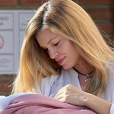 La ex top model dio a luz a la pequeña Galia en la Clínica Ruber de Madrid. Abandonó el centro hospitalario radiante y con la niña en brazos