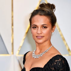 Alicia Vikander con moño alto y maquillaje natural en los Oscars 2017.