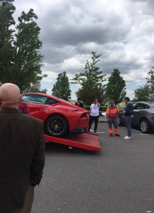 En unas imágenes en exclusiva de la revista, que no da detalles sobre si se trató de una avería o un incidente,se ve a Albalá preocupado mientras la grúa retira su nuevo Ferrari.