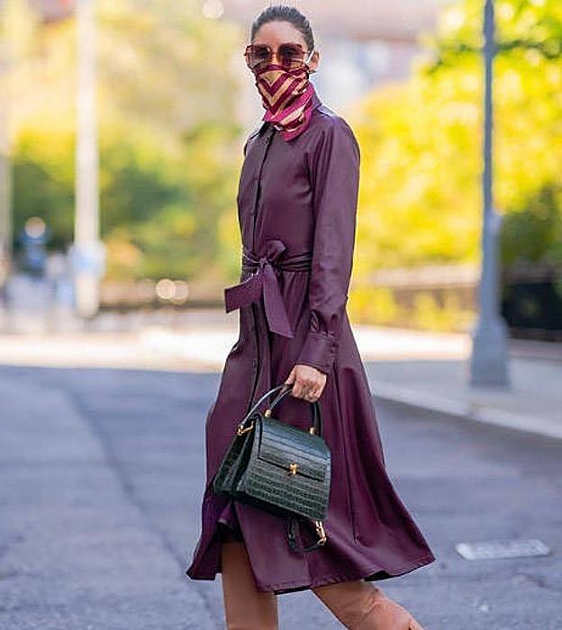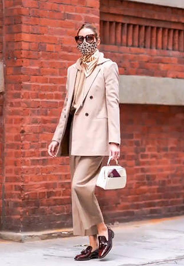 Para Olivia Palermo el estilo está presente también en el simple hecho de llevar mascarilla. De hecho la neoyorquina suele integrar este complemento y ocultarlo con algún pañuelo que combine con su estilismo. En concreto ella opta por los pañuelos en formato cuadrado, para después doblarlos en diagonal consiguiendo un triángulo perfecto y finalmente los anuda por detrás de la cabeza. Además a este complemento también suele agregarle unas gafas de sol para reforzar la sujeción del pañuelo.
