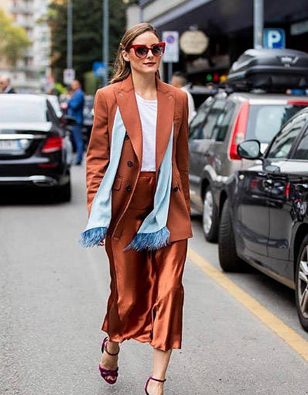 En este look que la socialité eligió para asistir al desfile de Max Mara en la Semana de la Moda de Milán, Olivia Palermo no dudó en combinar una blazer y una falda midi satinada a juego con uno de sus pañuelos. En concreto se trató de un pañuelo largo azul claro y acabado en flecos, que utilizó para conseguir un efecto de contraste cromático con el resto del look. Un truco estilístico muy favorecedor y al que ya había recurrido en looks anteriores.