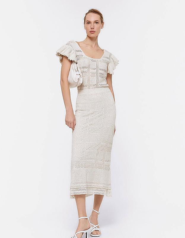 En esta ocasión, Sara ha elegido un conjunto de top de punto con escote cuadrado, detalles calados en tono arena y manga corta con volantes con los que la periodista se suma nuevamente a una de las tendencias claves y a la que ya se había sumado a principios del verano con uno de sus vestidos más copiados. Top que ha conjuntado con una falda de tubo en el mismo color, también con detalles calados y volantes en el bajo.