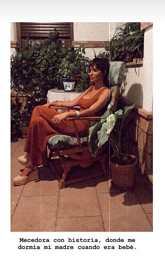Un look que la propia presentadora compartía hace unos días en uno de sus stories de Instagram y a través de una instantánea en la que aparece sentada en una mecedora en su vivienda familiar y concretamente en la que su madre la dormía «cuando era bebé», como ella misma ha explicado en dicha fotografía.
