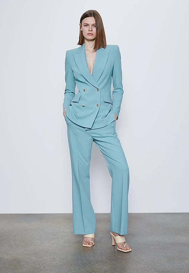Una de las opciones nos la propone Zara, con este traje de chaqueta en color azul agua y con pantalón fluido de tiro medio y bajo acabado en evasé, al que ya se han apuntado algunas influencers como Sandra Majada y cuyo precio total es de 79,90 euros.