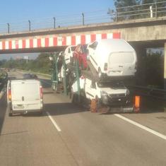 Más cerca de Oviedo, a la altura de la salida hacia Lugones, un camión de transporte de vehículos que circulaba también en sentido a la capital del Principado ha quedado encajado bajo un paso elevado, imponiendo una circulación lenta en la zona.
