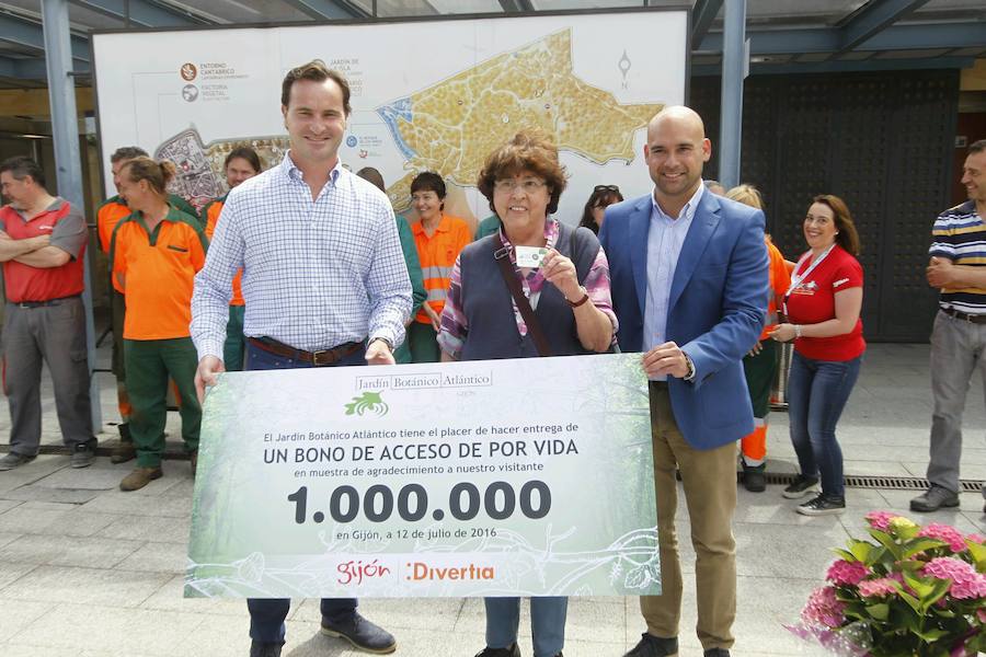 El Jardín Botánico Atlántico de Gijón ha recibido hoy una visita muy especial. Después de que abriera sus puertas en abril de 2003, la institución acogió al asistente un millón. La agraciada ha sido Carmen Santiago, de Madrid, que se encuentra de vacaciones en Gijón y que se ha llevado un surtido de regalos del Botánico y un abono vitalicio para poder visitarlo siempre que quiera.