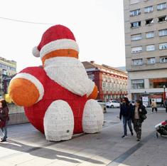 El orondo y ya familiar Papá Noel gigante que desde hace unos años consigue arrancar una sonrisa a pequeños y mayores en la Navidad gijonesa ya no está en la plaza de San Miguel. El 'grandullón' fue desmontado y trasladado anoche hasta la plaza del 6 de Agosto, ubicación que ya tuvo en años anteriores.