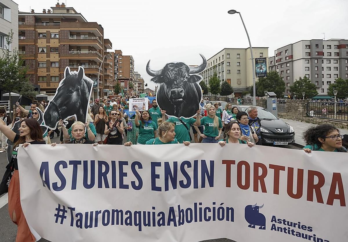 La manifestación arrancó desde la plaza de San Miguel rumbo a la plaza de toros. Abría la comitiva la pancarta de Asturies Antitaurina, organizadora de la misma, bajo el lema 'Asturies Ensin Tortura' (Asturias sin tortura) y grandes carteles con la cara de un toro y de un caballo. Acompañaron la protesta personas de todas las edades e incluso mascotas. «La gente está respondiendo y cada vez somos más. Por suerte, hay mucha gente joven y familias, algo que nos alegra», indicó Blanco. También se dejaron ver la edil de Podemos Olaya Suárez y el edil de IU Javier Suárez Llana.