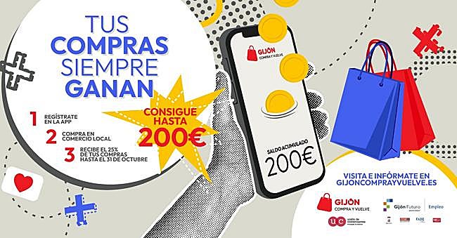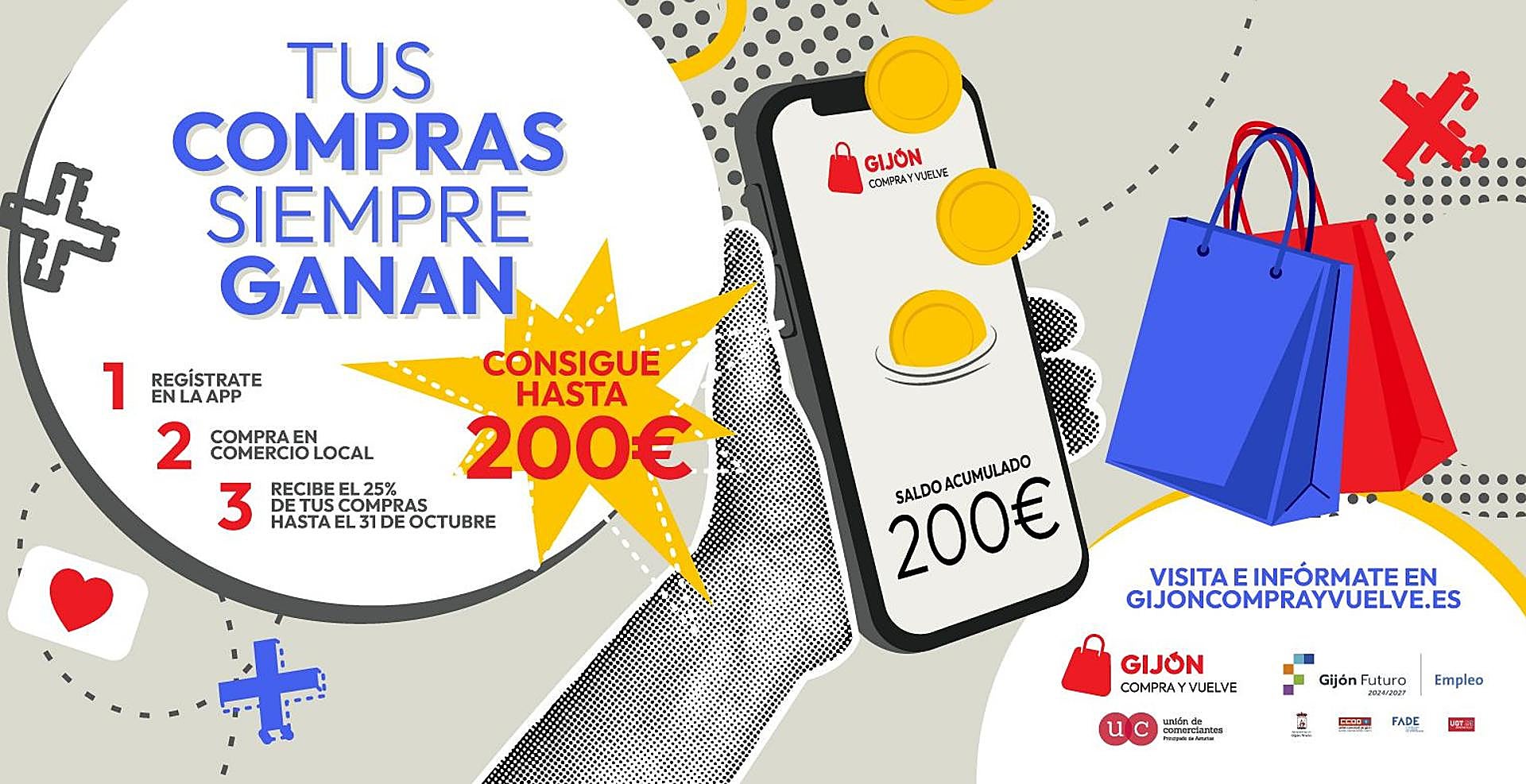 «Gijón Compra y Vuelve» es una iniciativa cuyo objetivo es incentivar las compras en los comercios de proximidad mediante un sistema de fidelización que ofrece a la clientela la posibilidad de obtener premios.